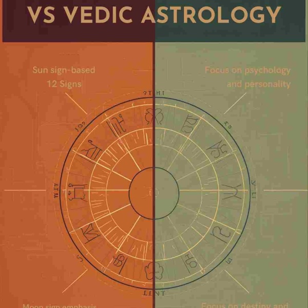 Vedic astrology focuses on karma and uses the sidereal zodiac, while Western astrology focuses on personality traits using the tropical zodiac.