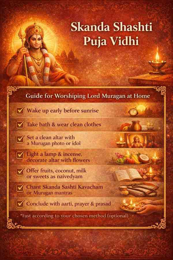 - Chanting – Recite the Skanda Shashti Kavacham, Kanda Sashti Kavasam, or simple Murugan mantras.